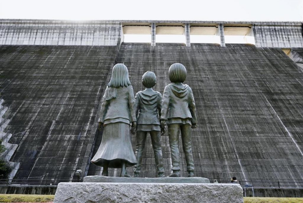 • The Setting: The statues stand at the base of the massive Oyama Dam, looking up at the dam wall in terror.