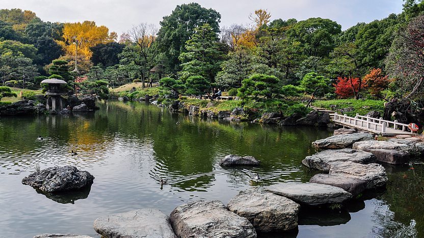 Located in eastern Tokyo, Kiyosumi Gardens is built around a large pond with stepping stones and expansive views.