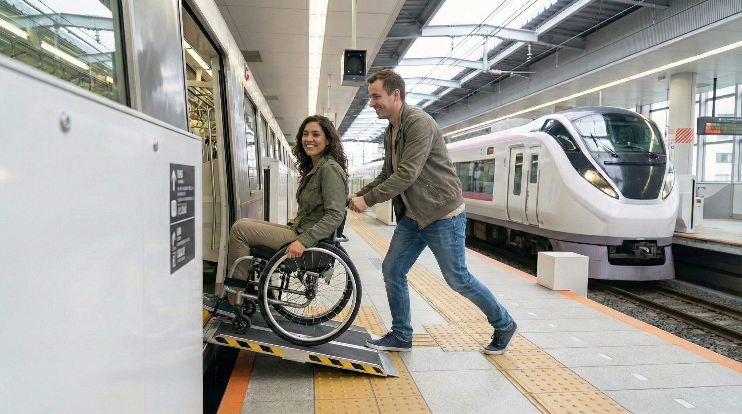 Note: This service is free. In major cities and staffed stations, usually no reservation is required; just show up and ask. However, for rural lines or unmanned stations (Mujin-eki), you must contact the railway company in advance to ensure a staff member meets you with a ramp.